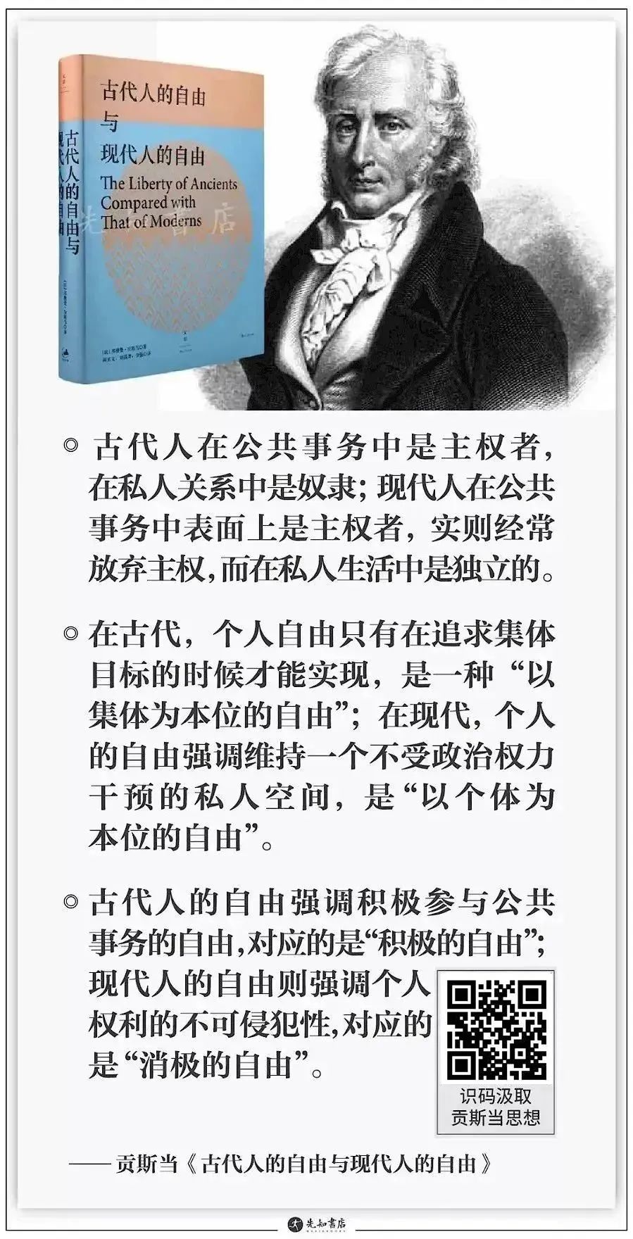 古代人的自由在于以集体的方式直接行使完整主权的若干部分:诸如在广场协商战争与和平问题,与外国政府缔结联盟,投票表决法律并作出判决,审查执政官的财务、法案及管理,宣召执政官出席人民的集会,对他们进行批评、谴责或豁免。然而,如果这就是古代人所谓的自由的话,他们亦承认个人对社群权威的完全服从是和这种集体性自由相容的。你几乎看不到他们享受任何我们上面所说的现代人的自由。所有私人行动都受到严格的监视。个人相对于舆论、劳动、特别是宗教的独立性未得到丝毫重视。我们今天视为弥足珍贵的个人选择自己宗教信仰的自由,在古代人看来简直是犯罪与亵渎。社会的权威机构干预那些在我们看来最为有益的领域,阻碍个人的意志。在斯巴达,特潘德鲁斯不能在他的七弦琴上加一根弦,以免冒犯五人长官团的长官。而且,公共权威还干预大多数家庭的内部关系。年轻的斯巴达人不能自由地看望他的新娘。在罗马,监察官密切监视着家庭生活。法律规制习俗,由于习俗涉及所有事物,因此,几乎没有哪一个领域不受法律的规制。因此,在古代人那里,个人在公共事务中几乎永远是主权者,但在所有私人关系中却都是奴隶——作为公民,他可以决定战争与和平;作为个人,他的所有行动都受到限制、监视与压制。作为集体组织的成员,他可以对执政官或上司进行审问、解职、谴责、剥夺财产、流放或处以死刑;作为集体组织的臣民,他也可能被自己所属的整体的专断意志褫夺身份、剥夺特权、放逐乃至处死。与此相对比,在现代人中,个人在其私人生活中是独立的,但即使在最自由的国家中,他也仅仅在表面上是主权者。他的主权是有限的,而且几乎常常被中止。若说他在某些时候行使主权(在这些时候,也会被谨慎与障碍所包围),更经常地则是放弃主权。除雅典外,在所有其他地方,社会的管辖权都毫无限制。正如孔多塞所言,古代人没有个人自由的概念。可以这样说,人仅仅是机器,它的齿轮与传动装置由法律来规制。同样的服从情形亦可见于罗马共和国的黄金时代那里,个人以某种方式被国家所吞没,公民被城邦所吞没。