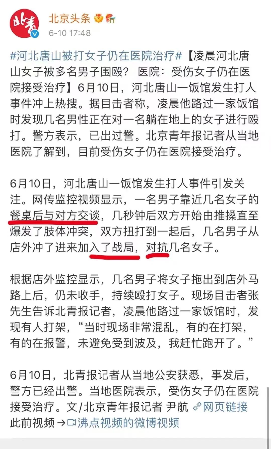 一觉醒来,看到互联网又被刷屏了。今天刷屏的事儿,叫「唐山打人事件」。唐山一个餐厅,几个男人揍几个女人。官方媒体的报道和警情通报也已经出来。视频点击率据说已经上亿。