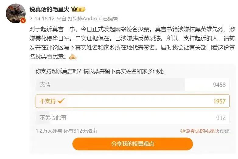 你看,以莫言的角度来看,毛星火已构成诽谤且情节严重。