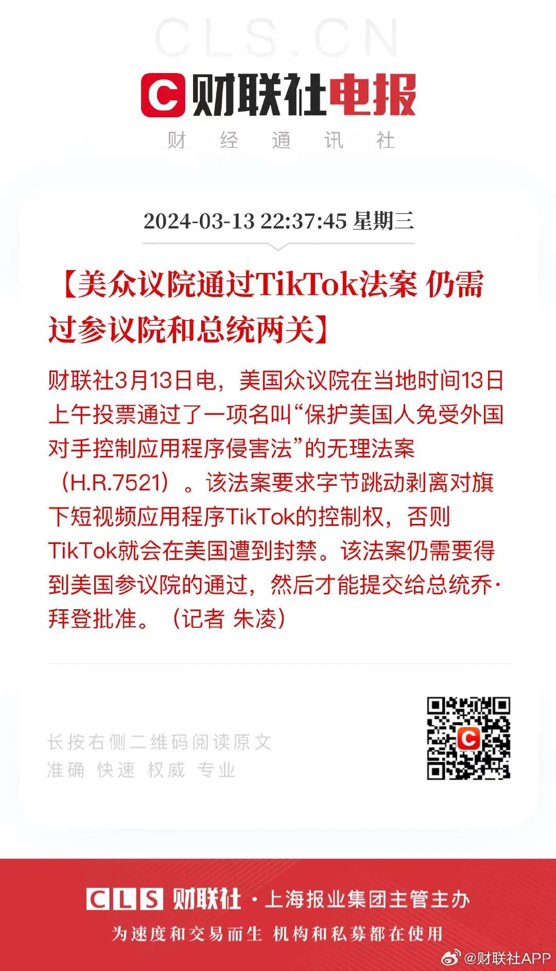 就在今天凌晨,美国众议院高票(352:65)通过了绞杀TikTok的法案。