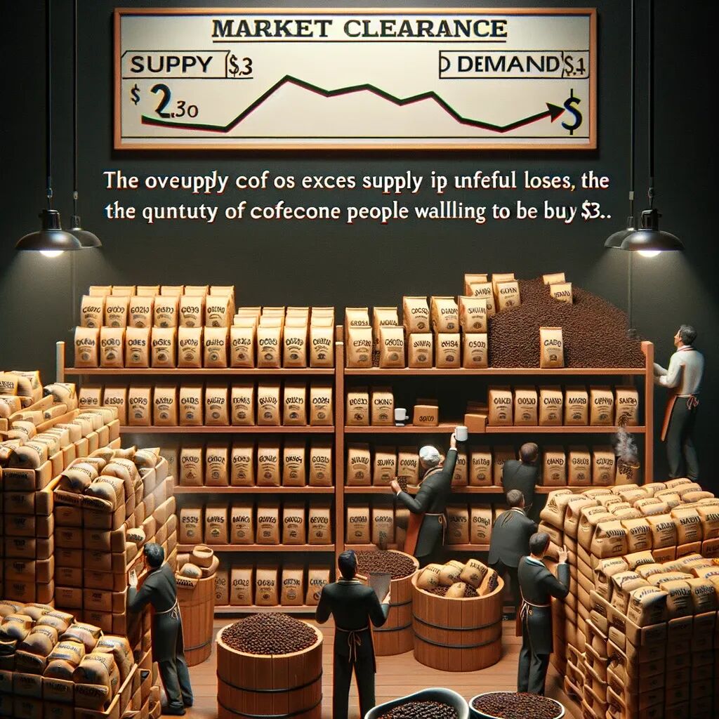 这导致咖啡过剩,未售出的咖啡积压在货架上。这种过剩的压力和可能的损失将迫使卖家降低价格,直到价格降到3美元,市场出清,即供给与需求达到平衡,市场上的咖啡数量与人们愿意购买的数量完全匹配。