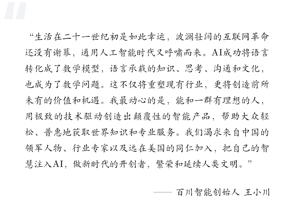 这个倒不至于,但是至少相当于瓦特1776年发明蒸汽机,那一年,美国也发表了《独立宣言》,也是一个奇迹年。看问题要看本质,ChatGPT并不仅仅是一个聊天工具,而是对自然语言处理的突破,聊天只是大语言模型其中一个很小的应用而已。 原搜狗的CEO,现在百川智能的老板,王小川说的一段话非常好,直指本质,我们贴在这里:一旦将自然语言可以转化为一个数学问题,计算机将在自然语言涉及的领域内,完全、彻底的超过人类,剩下的只是时间问题。而人类,就是用自然语言交流的,无论是文字、语言、语音、图像还是视频。为了这个目标,人工智能领域整整奋斗了70多年,人工智能的老教授们知道这个结果,估计都是老泪纵横,居然活着看到这一天了。来自安徽六安的小杨哥,无疑是直播圈里面最闪亮的星,直接支撑起一家公司,成为一个现象级的网红。董宇辉,则成为东方甄选这个上市公司的中流砥柱,董老师受了委屈,都能连续上好几天热搜,东方甄选股价连跌,粉丝哗哗的掉。就不要说李佳琦这种头部网红了,说错一句话,都要被全网声讨。风波过去,李佳琦依然是很多女人中那个“不亏是我花钱养的男人”。现在是产能过剩的时代,货并不是最重要的,找谁买不是买?风口的含义,就是钱都往这边投,水涨船高,把整个行业抬起来。风口就是AI,钱都在往这边涌,AI相关的初创公司纷纷成立,大公司也纷纷入局。百度发布了文心一言,阿里发布了通义千问,腾讯发布了混元大模型。百度全面All in AI,阿里换帅,押注AI电商。字节在这场竞争中已经落后,但是已经有了一个云雀大模型。