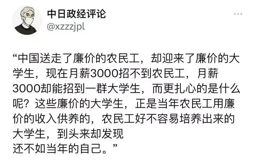 刚毕业的普通大学毕业生坐在空调房敲敲键盘,工资就比干苦力的农民工更高,那才是不正常。