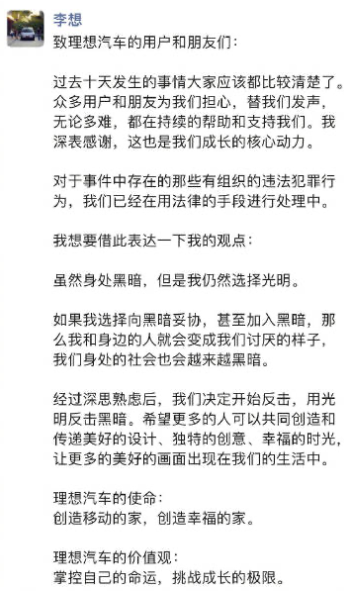 结果被网友调侃为“太君亲自下场抗日”,因为7-11本身就是日本品牌。7-11很快回应此事,称此举系常州两门店员工个人行为,不代表公司总部立场。这两家店的店员“一身正气”,实际上是端起碗吃饭,放下碗骂娘,结果发现骂的还是自己的亲娘。他们大概不知道,7-11原来是一个美国品牌,后来逐渐由日本伊藤洋华堂控制。起源于美国,最终成为日本品牌,在中国开店,合法经营纳税,解决就业问题,经济全球化的今天,你很难说这到底是一家哪个国家的公司。这两家贴告示的店员店长们,也就是普通打工人,大概率不知道这背后的品牌历史。但问题恰恰就在于,大家都是打工人,何苦为了网上一些毫无根据的诋毁就轻易互相伤害呢?今天你抵制农夫山泉,明天别人就来抵制你的7-11,把你店搞的关门了,工作都丢了,这又是何苦呢?底层何苦要为难底层?最近被架在火上烤的还有李想和理想汽车,面临的舆论困境和农夫山泉差不多,背后既有可能是有组织的围攻,也有吃瓜群众的跟风起哄。你说这是犯罪吧,很可能算不上,因为有些东西毕竟都是主观解读。即便是有组织的引导舆论,恐怕也很难在法律上定性为侵权。但是这种舆论造成的伤害却真实存在,只是逻辑链条比较长,无法直接建立法律上的因果关系。对于李想来说,如果这个时候用法律武器来打压或者引导舆论走向,可能未必是最好的办法。MEGA发布之后,就有人爆出理想法务部门要求删帖的函件,结果反而造成了更大范围的传播。这个事一开始就该冷处理,不要让它连续发酵,占据消费者心智。现在依然是冷处理比价好,用法律来禁言不现实,追究各种评论者的责任也不现实,因为法律无法禁止别人的联想。比较现实的是,用销量和数据说话,打消摇摆者的顾虑,让大家知道,市场并没有受到网络攻击的影响,或者说影响不大。特别是,MEGA刚刚开启交付,L系列升级量也很充足的情况下,拿出最大的诚意,加量不加价,反而降价。在利润和成本可控的情况下,比如MEGA降到50万以下,L系列降个两三万,销量上去,规模效应起来,人们关注和讨论的重点就会重新回到车辆本身,而不会太在意那些负面评价。降一次如果不够,那就再降一次,对于真正优秀的产品,没有什么是降价解决不了的问题。作为理想车主,MEGA的造型我觉得还不错,科技感十足,但缺点也很明显。几个问题,首先就是只有纯电,没有增程,现阶段里程和补能焦虑依然是客观现实,尤其是在北方,纯电会劝退很多人。有增程,人们可以不选,但没有增程,很多人就没有选择。包括理想现在很多老车主,如果不是增程,压根就不会考虑。而且只做纯电的企业,除了特斯拉就没有几家财务状况比较安全的,都在硬撑。第二个问题就是价格,我认为定高了,56万加上税落地要近60万了,这个价格对于土豪大哥来说不是问题,但对于一般家庭来说是需要斟酌的。尤其是在今年几大厂家都快杀疯了,3月1号一天内就有9家车企降价,这个时候这个价格,也是劝退的原因之一。如果定价在50万以内,和L9拉开一定档次差距,再配上增程选项,这个车绝对还是有很大杀伤力。最后说下企业家的问题,任何国家任何时候,企业家都是稀缺的。企业家不仅需要有想法,还要能把想法落地,能够预测消费者需求,能够拉到资本给自己投资,还要能够吸引人才跟着自己干,能够整合供应链,还要能够把厂子建起来投产,最后还要建立销售体系,把产品交付给消费者。一个成功的企业家,也许不是学习最好的那个,但他一定是一个复合型人才,是最能打的那个。李想的学历就是高中毕业,但这并不妨碍他连续做成了三家企业。不说别的,一个公司上市成功,背后估计能带起几十个百万富翁,十几个千万富翁。个人的成功自然不必多说,这三家企业背后创造的价值,解决的就业,无论如何都不可磨灭。所以,于公于私来看,对于任何能够创造价值的企业和企业家,都没有必要为了黑而黑。不喜欢产品归不喜欢产品,搞些下三滥的小动作,或者借永远正确的“爱国激情”泄私愤,最后反噬的恐怕还是自己。相比为难这些民营企业,某些常年亏损的国企,却少有人这么去大规模去抵制,也不见他们去抵制两桶油,倒掉油箱里的油。说到底还是成本问题,站在最安全的道德制高点,选择最小的成本和最安全的代价,表达最激烈的热情,一切不过是廉价的表演罢了。上一篇:米莱的“五月公约”,将会把阿根廷带向何方?