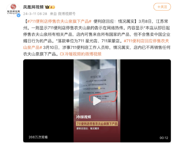 最近看网上消息,没想到啊没想到,有些人真的是魔怔了,21世纪都快过去四分之一了,这些人的思想还停留在一百多年前,甚至是大清时期。历史的车轮滚滚向前,但人类文明却并不总是在进步,进一步退三步是常态。当然不光是中国这样,美国、阿根廷、欧洲,都这样,哪里都有些奇葩。有奇葩不可怕,可怕的是他们竟然能兴风作浪成了气候。如果说经济形式一片大好也就罢了,就现在这个形式,这些人竟然还有闲心出来搞这些事情。莫言、清华、农夫山泉,一个个跟过堂似的,就连华为可能都无法幸免。因为麒麟芯片一词的缩写是日语发音Kirin,结果被人拿来说事。真是奇葩年年有,今年特别多。江苏一家711便利店贴出告示:本店从即日起停售农夫山泉所有相关产品,店内可售来自所有国家的产品,但不会售卖中国企业媚日行为的产品。