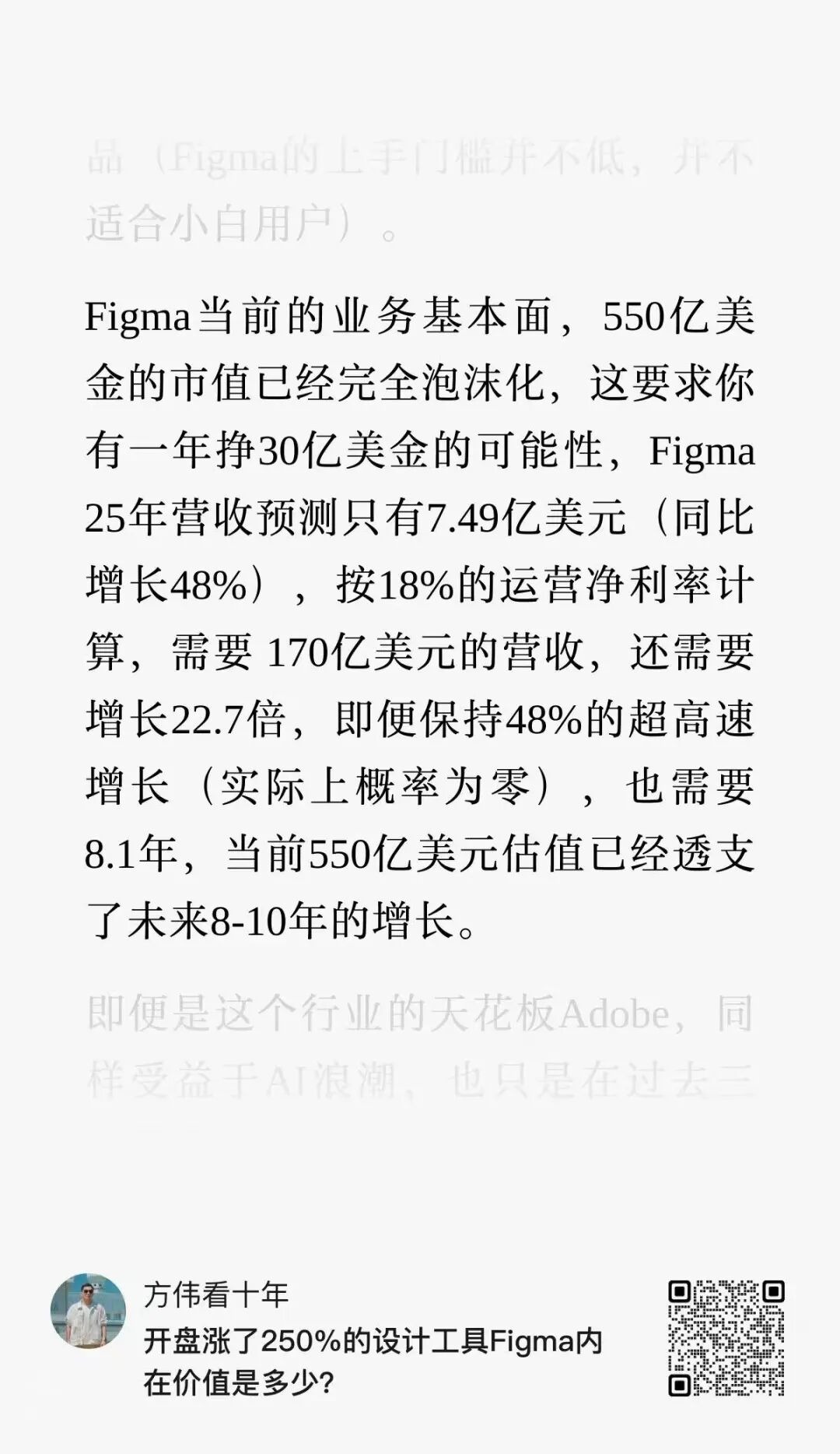 东方甄选当然没有办法跟 Figma 比,东方甄选是好团队,但不是好生意,更没有好价格,而 Figma 是好生意+好团队,但没有好价格,200 亿美金左右的 Figma 是更加合理的,前个月 550 亿真的是 AI 泡沫化了。
