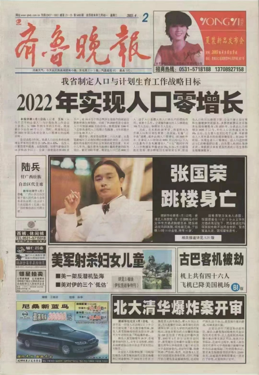 这是一张《齐鲁晚报》头版图片,时间显示是2003年4月2日,星期三。