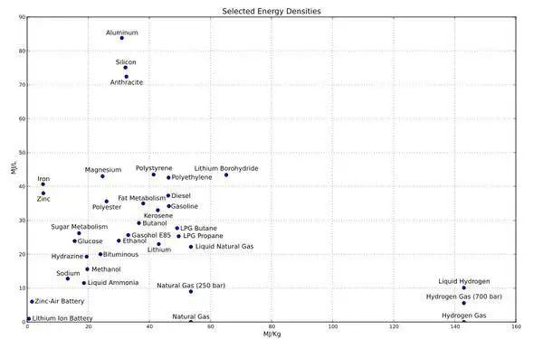再比较一下能量密度。先看看锂电池的能量密度预测。下面这种能量密度表的左下角那个接近于零的,就是锂电池。它属于能量密度极低的物质。
