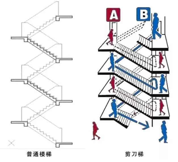 以上说的都是硬件上的准备,万一发生火灾的极端情况,如果自己控制不住火势,能逃赶紧逃,所以首先要熟悉逃生通道。根据《高层民用建筑设计防火规范》的规定,超过 18 层,每个单元设有一座通向屋顶的疏散楼梯,而且 18 层以上部分每层相邻单元楼梯通过阳台或凹廊连通。我们这栋楼总高 28 层,但的确是没有令很多人不爽的消防连廊的。因为它设计使用的是「剪刀梯」,下面示意图可以看出普通楼梯和剪刀梯的设计不同。剪刀梯有 A、B两套楼梯,而且这两套楼梯是物理隔绝的。