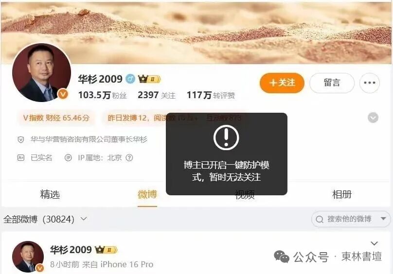 结果时间一到,华杉干了什么?他什么也没说,直接把微博开了“一键防护”模式。