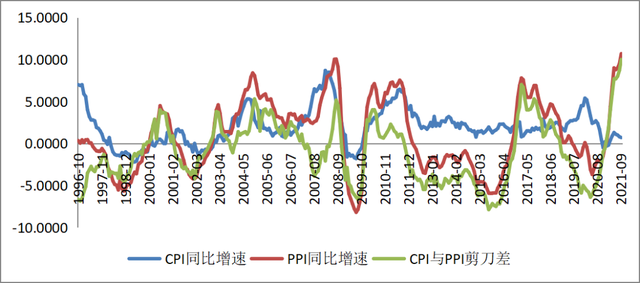 CPI环比持平,同比涨幅略有回落。从环比看,CPI由上月上涨0.1%转为持平。从同比看,CPI上涨0.7%,涨幅比上月回落0.1个百分点。PPI同比上涨10%以上,超过了2008年次贷放水之年,突破了历史记录,而CPI与PPI之间的剪刀差,也突破了历史记录。那问题就来了,大宗商品不断涨价,为何消费品价格却没有动静呢?首先,这种剪刀差是基于这两个国家统计数据来的。