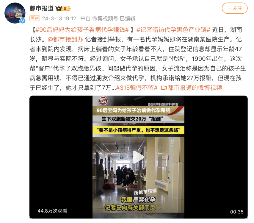 今天微博热搜的一则报道,关于代孕的,虽然前两年写过几篇文章,但还是有些话不吐不快。