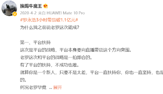 在2020年4月2号这个时间点,很多大V依然是不看好的,认为罗永浩会高开低走,虎头蛇尾的不是少数。