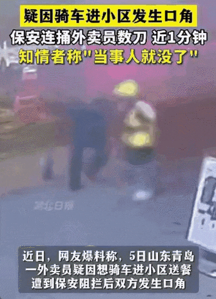 首先我们必须承认,该起事件是一起偶发的恶性凶杀案,那个杀害外卖小哥的保安,你就很难将他归为一个“正常保安”,正常保安谁闲着没事带刀上岗执勤,一言不合捅别人一刀啊?可以想见,在这起悲剧发生之前,这个保安身上其实已经自带了一种戾气,隐约产生了那种无差别攻击,就是要找一个人来捅一捅的恶念。而那位外卖小哥,则不幸撞到这个恶徒的倒扣上。甚至他有可能是为该小区业主挡了刀——反正刀已经在手了,如果这个恶徒不是因为当天的争执捅了他,他没准也会为别的争执去捅别人。![]()