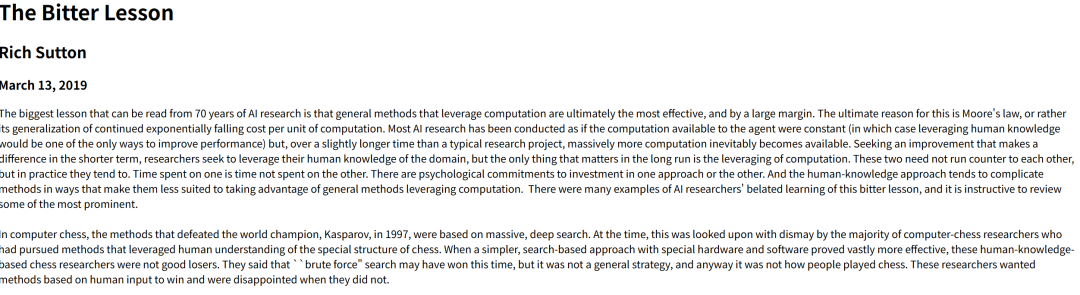 在2019年,机器学习先驱,图灵奖获得者,理查德.萨顿 在 2019 年写了一篇经典文章《苦涩的教训》,将这个事情一锤定音。