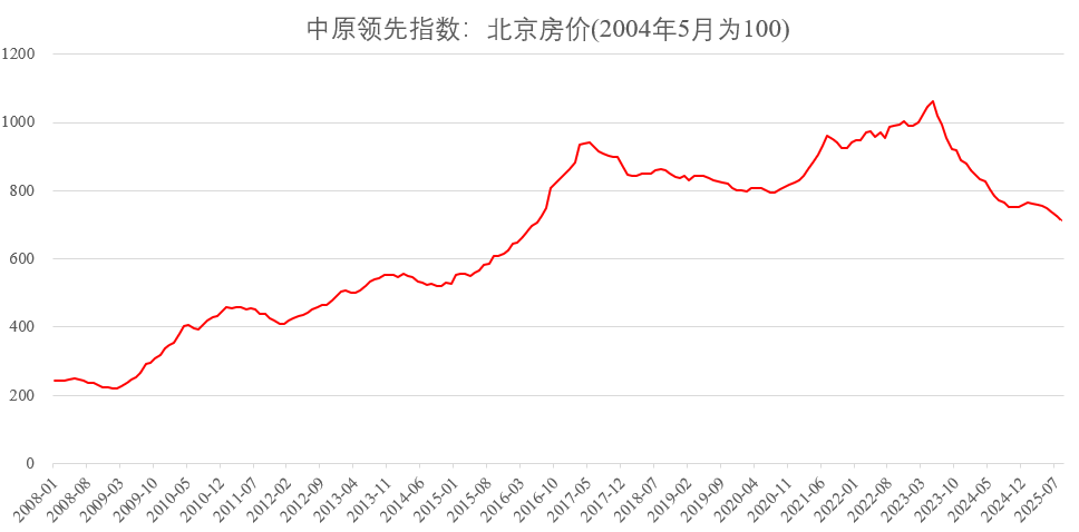 从7月份到8月份,北京房价指数从726跌至713,算下来跌幅是1.8%。