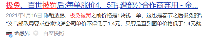 你可能忘了,今年早些时候,极兔为了竞争主动寻求降价,结果因为被认为价格过低,还被处罚,价格被迫涨到1.4元,结果失去了竞争力,被部分合作商家弃用。