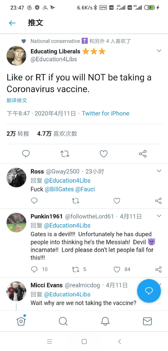 推特上有个右翼意见领袖,抵制疫苗,评论区的基督徒纷纷响应号召。