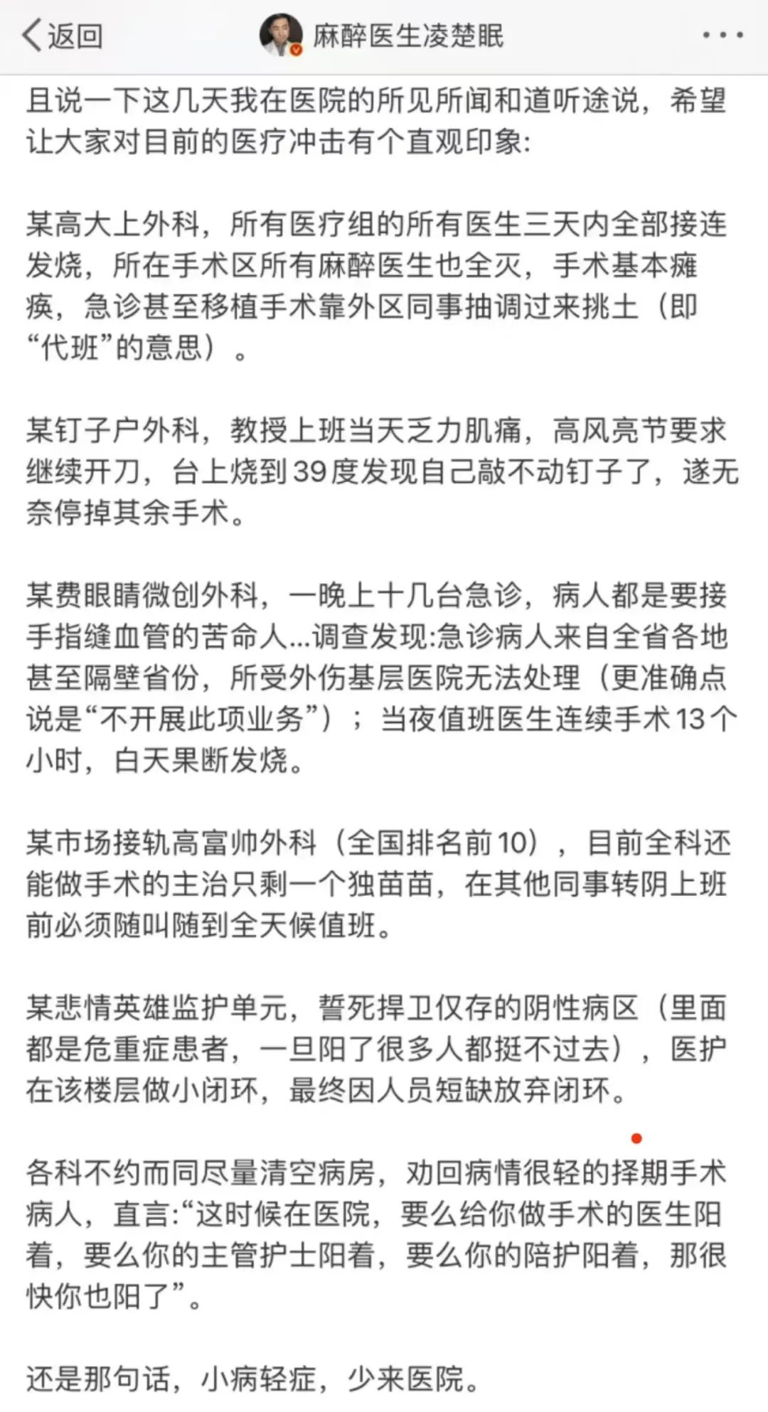 记住凌楚眠医生的建议:小病轻症,少来医院。你去一个大多数医生护士都在新冠生病期间的医院,少数医生精疲力尽给你看病或做手术,你觉得疗效可以保证么,你能确定医生有体力给你完成手术么。