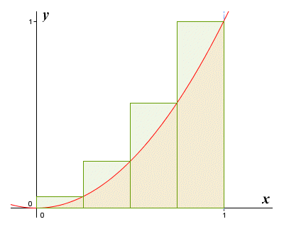 我们假设0到1之间被平均分成了n份,那么每一份的宽度就是1/n。而矩形的高度就是函数的纵坐标的值,纵坐标可以通过y=x²很容易算出来。于是,我们就知道,第1个矩形的高度为(1/n)²,第2个为(2/n)²,第3个为(3/n)²……