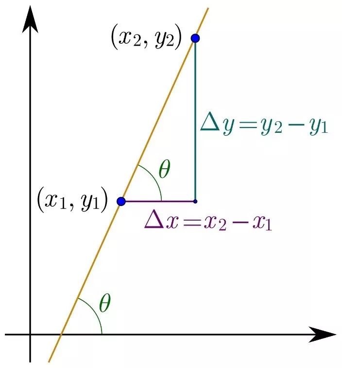 所以,我们就可以在直线上随意找两个点,用它们纵坐标之差Δy和横坐标之差Δx的比值(Δy/Δx)来定义这条直线斜率。学过三角函数的同学也会知道,这个斜率刚好就是这条直线和x轴夹角θ的正切值tanθ,即:tanθ=Δy/Δx。这就是说,直线和x轴的夹角θ越大,它的斜率就越大,就倾斜的越厉害,这跟经验都是一致的。