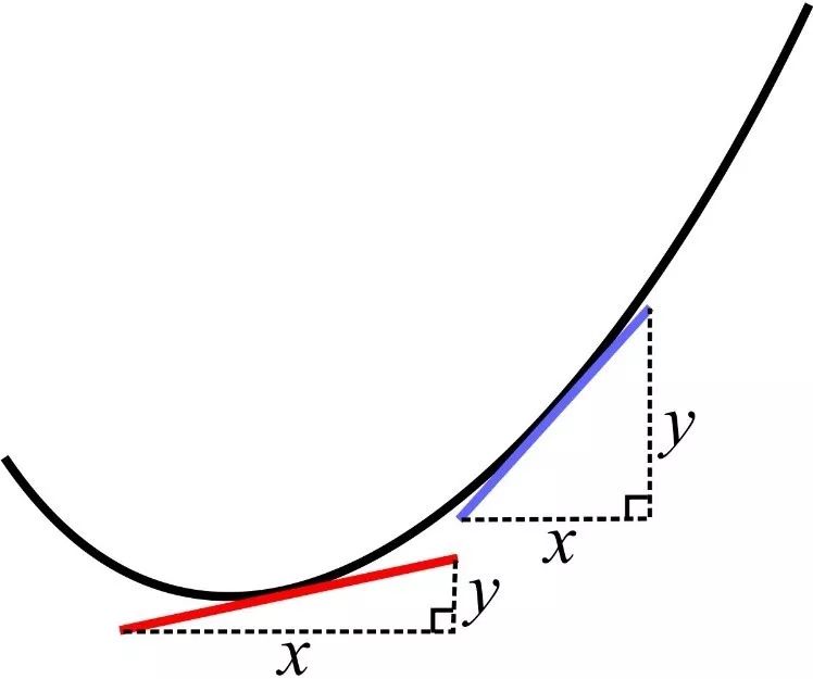 显然,我们在曲线的一点上定义了切线,那么在平滑曲线的其它点上也能定义切线。因为每条切线都有一个斜率,所以,曲线上的任何一点都有一个斜率值跟它对应。两个量之间存在一种对应关系,这是什么?这就是函数啊。