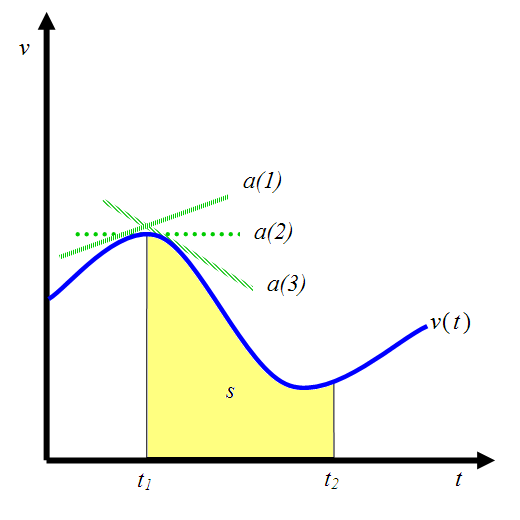 好,下面是关键:积分是函数围成面积的过程,速度v通过积分就得到了位移s,在v-t图像里速度v围成的面积就是位移s;微分是求导的过程,对位移s求一次导数就能够得到速度v。