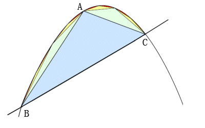 他先画了一个蓝色的大三角形ABC(这个三角形并不是随意画的,抛物线在A点处的切线必须跟BC平行。这里我们不细究,只要知道能够画出这样一个三角形就行)。当然,这个三角形ABC的面积肯定比弓形的面积小,小多少呢?显而易见,小了左右两边两个小弓形的面积。如果我们能把这两个小弓形的面积求出来,加上三角形ABC就可以求出原来大弓形的面积了。但是,如何求这两个小弓形的面积呢?答案是:继续用三角形去逼近!