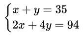 第一步,把方程1两边都乘以2,得到2x+2y=70(这不就是跟我们上面的方法一样,把所有鸡兔的头都乘以2么)。