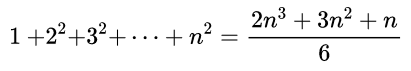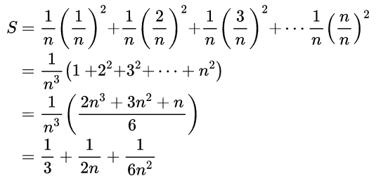 有了宽和高,把它们乘起来就是矩形的面积。于是,所有矩形的面积之和S就可以写成这样:这只是一段普通的化简,相信大家只要知道平方和公式是下面这样就秒懂了:因为n是矩形的个数,n越大,矩形的数量就越多,那么这些矩形的面积之和就越接近曲线围成的面积。所以,如果n变成了无穷大,我们从“直觉”上认为,这些矩形的面积之和就应该等于抛物线围成的面积。