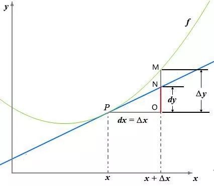 这个dx和dy还是有意义的,当然,有意义也肯定不可能再是以前无穷小量的意思了。那么,在ε-δ极限这种全新的语境下,dx和dy在新时代的意义又是什么呢?请看下图:蓝色切线的斜率表示在P点的导数,如果我们继续用dy/dx表示导数的话,那么从图里就可以清楚的看到:dx表示在x轴的变化量,dy就刚好表示蓝色的切线在y轴的变化量。