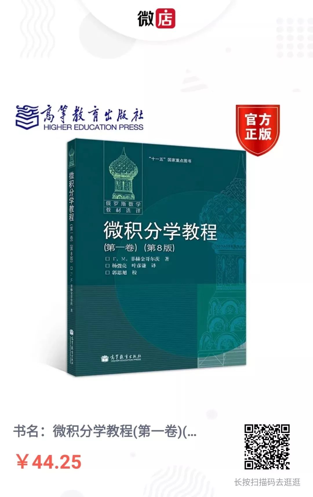 最让我震撼的还是苏俄的教材,当然,我这里说的就是菲赫金哥尔茨的《微积分学教程》。在俄罗斯流传着这样一句话:只要莫斯科大学的数学系大楼不倒,俄罗斯就永远不会倒。前段时间华为那个“只会做数学,不会谈恋爱”的俄罗斯小伙还火了一把,2003年解决庞加莱猜想的佩雷尔曼也是俄罗斯人,说明俄罗斯的数学还是有两把刷子的。一般来说,一本教材的严密性和通俗性是很难做到两全的,但是就《微积分学教程》做到了。这本宛如学术专著一般的教材,在严密性上自然无可挑剔,逻辑层层铺垫、层层递进,自成体系,就像《几何原本》一样。然而,这本书里又有大量物理、几何等例子,在解释重要的数学思想时又会不惜笔墨用文字描述清楚,绝对不是“公式里来,公式里去”,这让这本书又显得非常通俗和实用。我在文章里写的内容,最后也以这本书为准,比如文章里微分的定义我就是用的此书174页的定义。这本书是我最喜欢的微积分教材,也是我心里一本理想教材该有的样子,通俗实用却又不失严密性,对于在数学上有理想有抱负的同学,这套书,力荐!(高等教育出版社只在这里有,《微积分学教程》有三卷,我这里只放第一卷,另外两卷可以去书屋里查看)![]()