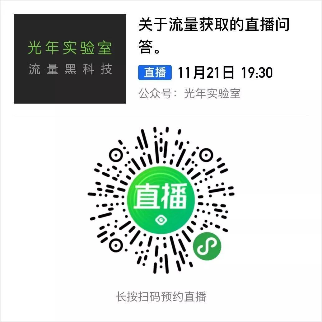 作为一个经常研究流量的人来说,直播是一个非常有意思的值得期待的事物。所以我也想玩票搞一场直播,在11月21日晚上7点半,我打算开一个直播来回答大家的各种流量问题,扫描以下二维码订阅提醒。