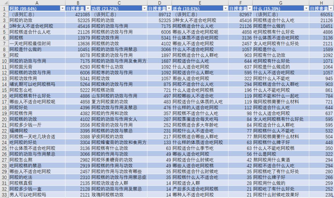 这种方法就是大家去定义一些和你的业务相关的核心词,如阿胶、滋补品等,再定义一些前缀和后缀等,然后再排列组合。这样出来的词就是:
