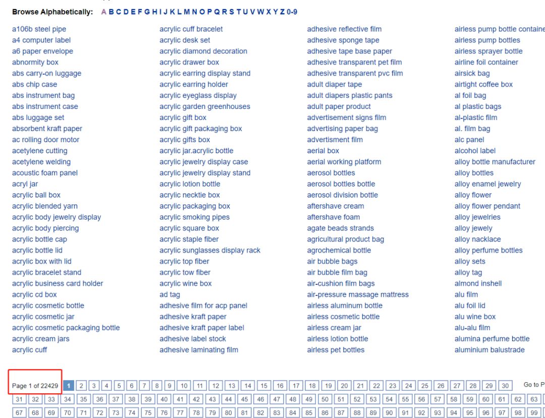 大家点一下A字母,这里都是以A开头的关键词,一页是120个词,A字母下有22429页。A到Z一共是2千多万个词。