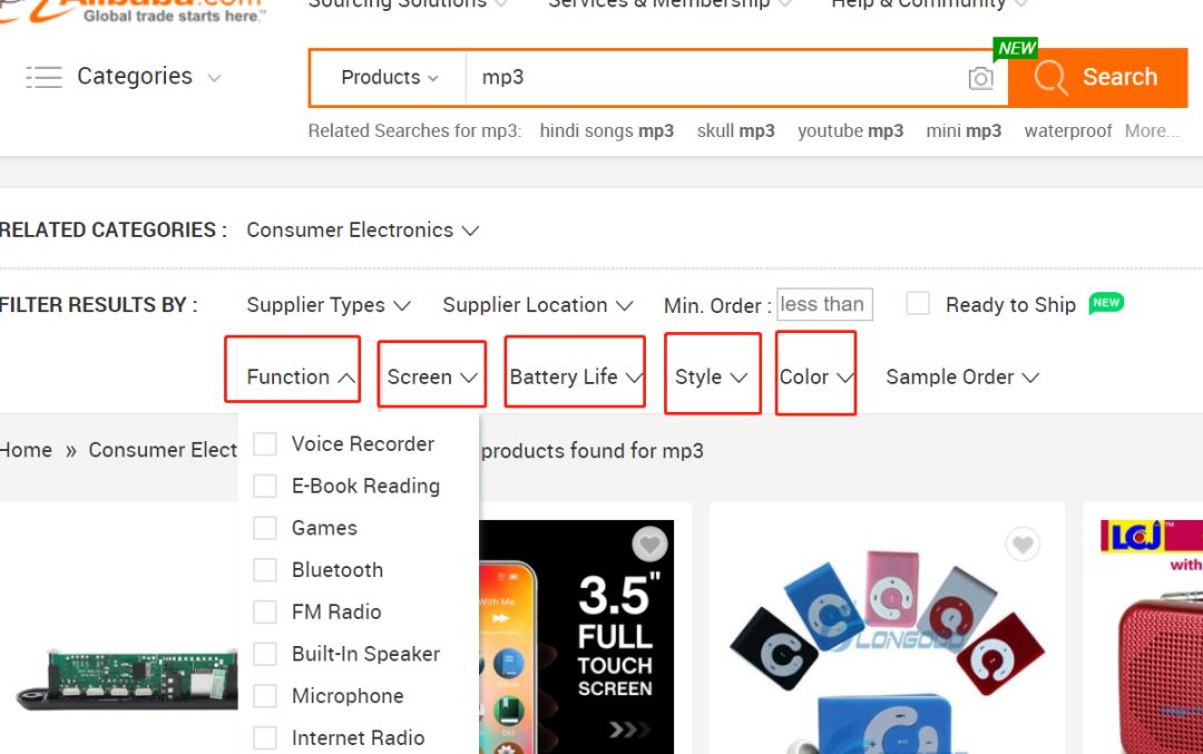 这里列出了MP3的一些属性,有按“功能”、“屏幕” “充电时间” “风格” 和 ”颜色”, 这里的属性分类以及每个分类里的那些项目,完全是按搜索引擎里用户的搜索量从高到低排序的。这样做的结果就是转化率和粘度非常高,比当时产品经理做的页面提高了4倍。