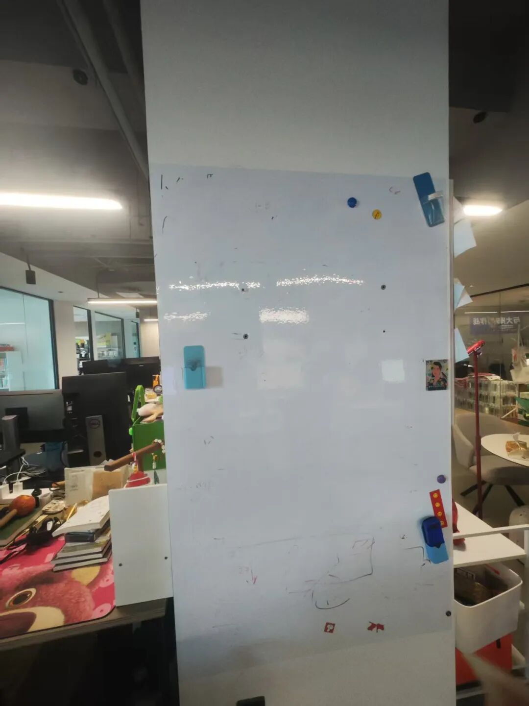 甚至,办公室里面的柱子,也可以被我改造成了白板。几个同事,如果突然间想要讨论问题了,根本就不用走两步去会议室。几个人往柱子那一站,拿起笔就可以开始讨论。