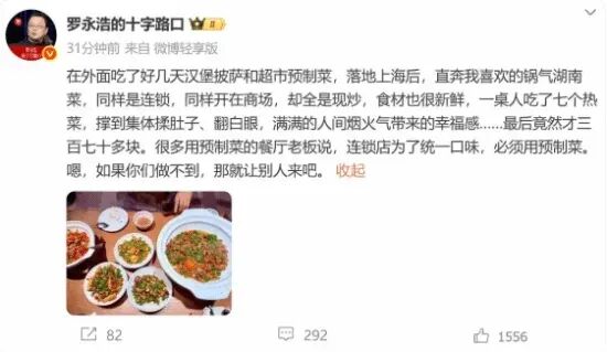 其次,为何偏偏是西贝? 退一万步讲,就算“预制菜”公示是天经地义,那这也是一个全行业普遍存在的问题和发展趋势。为何罗永浩的万丈怒火,偏偏只对准了西贝一家?