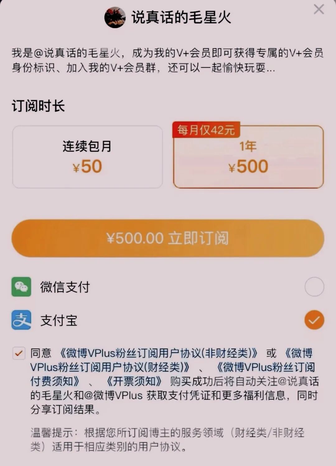 我特意到微博上去看了一眼,发现他搞的知识付费收费还不低,开设了“小店”和“博主精选”订阅、付费专栏。包月每月50元,如果包年,则一次付费500元“每月仅42元”。