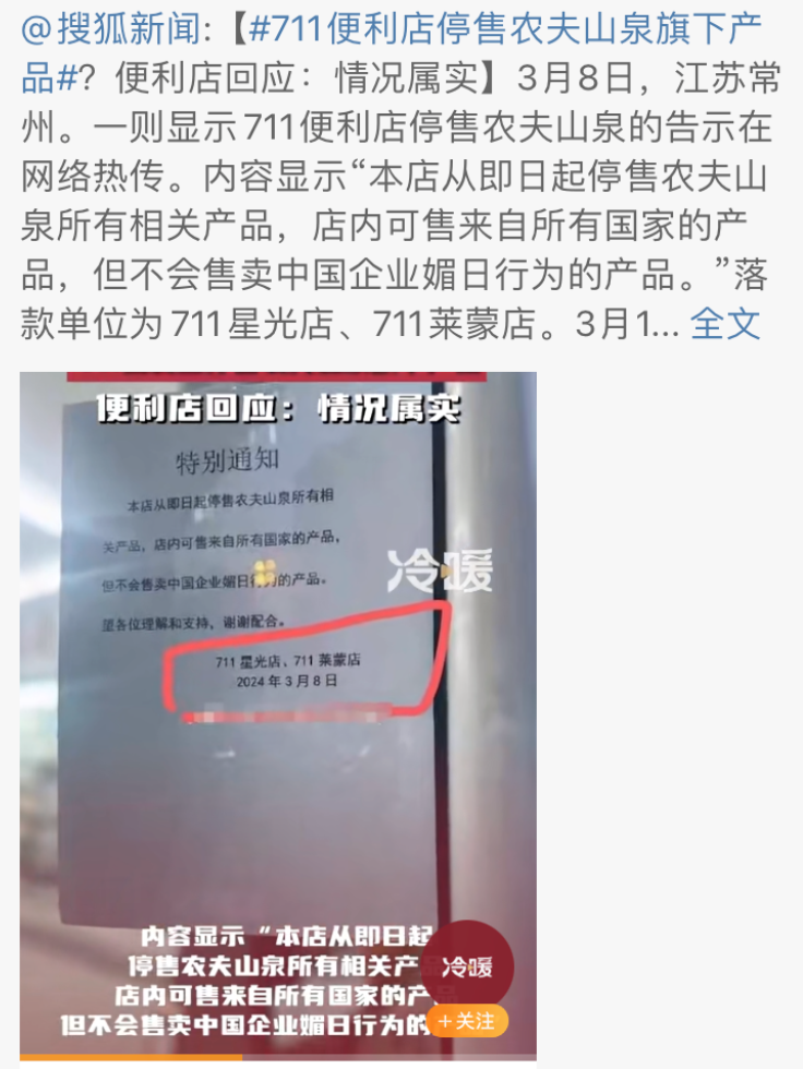 一是全网批判农夫山泉“媚日”的方波越闹越凶,某地的两家711便利店在他们的店面贴出了一条告示,告示的内容是——“本店从即日起停售农夫山泉所有相关产品,店内可售来自所有国家的产品,但不会售卖中国企业媚日行为的产品。”