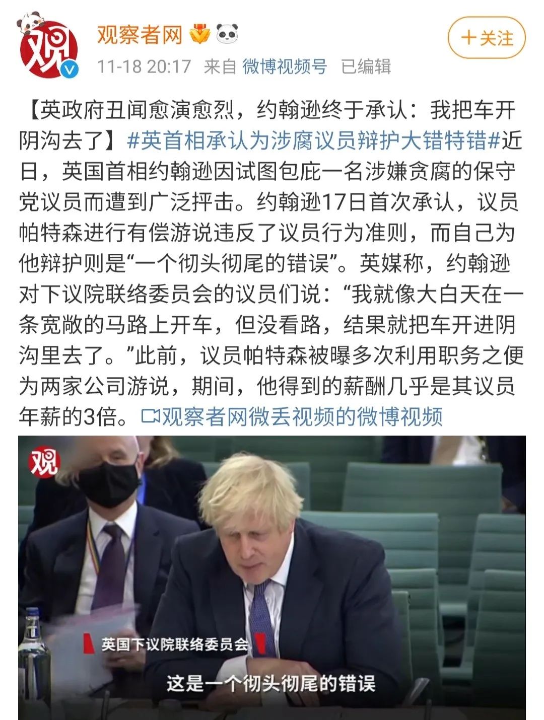 问题的关键在于,这些议员这么做,并没有多大问题,否则约翰逊怎么可能明目张胆地袒护一个腐败分子?
