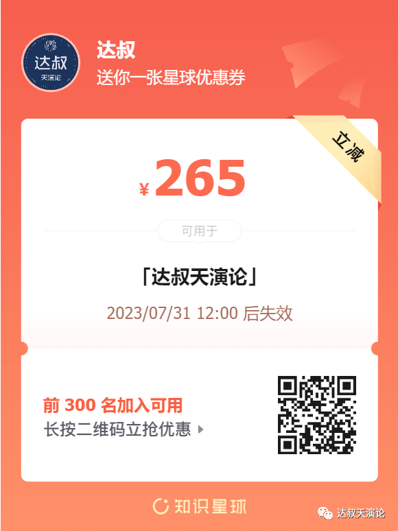 达叔星球,第三期了,为感谢之前各位星友的厚爱和支持,特推出优惠券: