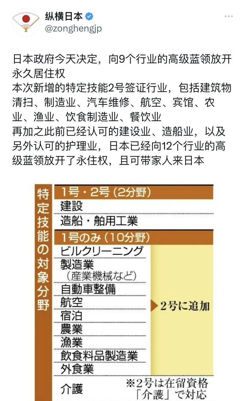 最近日本就开放了9个行业的高级蓝领永久居住权。