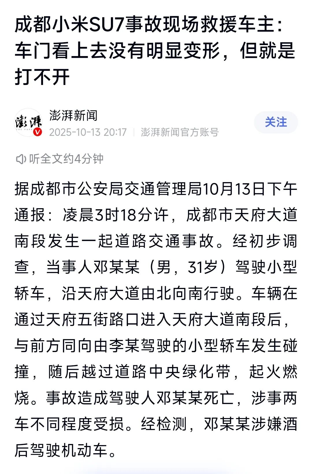 如果司机开的车是一辆合格的车,是一个良心企业的良心产品,是一辆碰撞后车门能打开的车,而不是“绿化带战神”,那他今天就活下来了,即使是因为酒驾要受到处罚,甚至可能被吊销驾照,但至少,他能活着,他的妻儿和父母就不会失去至亲至爱。