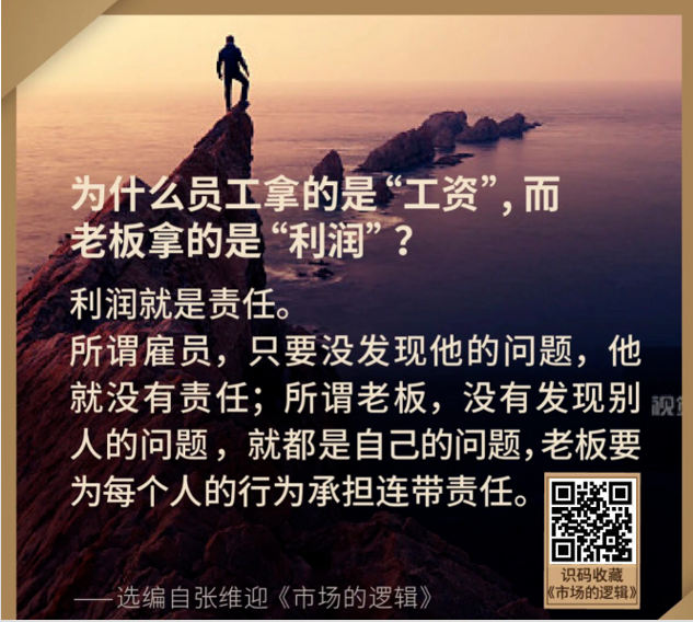 利润本身是一种责任,你只有替别人承担了责任,最后才能赚钱。老板必须负责任,如果找不到员工的毛病,就是老板的毛病。作为员工,只要找不到他的毛病,他就没责任。比如开餐馆,如果不知道哪个员工出了问题,餐馆的老板就要负责任。