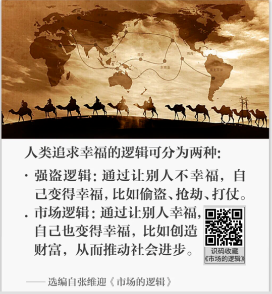 市场的逻辑其实就是人类追求幸福最好的办法。也就是说,人们要通过给别人带来幸福的方式,让自己幸福。例如企业只有给客户创造价值,才能够真正获得收入。