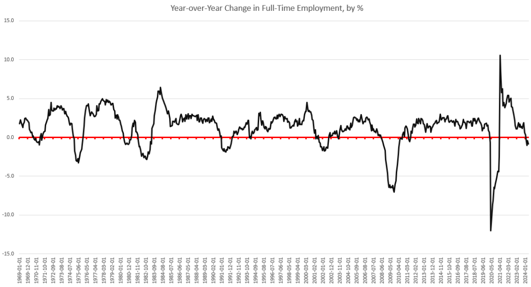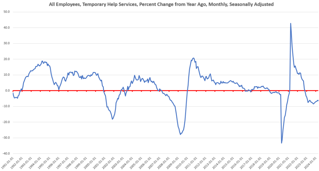事实上,根据另一份报告 ,家庭总就业人数与2023年6月的水平基本持平。也就是说,去年6月的就业总人数为161,004,000人。2024年5月,总数为161,083,000。换句话说,近一年来,总就业人数一直持平。然而,公众月复一月地听到美国正处于就业“井喷”之中。在这份就业报告中,还有一个逻辑矛盾的地方,那就是一方面非农就业人数强劲增长,但失业率却上升到了4%。在就业总人数停滞不前的11个月里,总就业岗位增加了250万,我们发现兼职工作主要在增长。在这11个月中,兼职工作总数增加了170万个。在同一时期,全职工作岗位减少了150多万个。仅在 5 月份,工人报告的兼职职位就增加了 286,000 个,而5 月份的全职工作降幅是自 Covid 恐慌以来的第二大降幅。事实上,在过去的两个月里,全职工作岗位的同比指标一直处于衰退状态。现在,2月、3月、4月和5月的全职工作岗位同比下降。在过去的五十年里,全职工作岗位连续三个月出现负增长一直是经济衰退的信号,并且发生在美国陷入衰退或即将进入衰退的时候:几十年来,每当临时帮助服务连续三个月以上年复一年地为负数时,美国就会走向衰退。在过去的19个月里,这一指标在美国一直是负面的。而兼职工作往往是经济低迷期间,企业降低用工成本的一种方法。当然,用统计来打败统计,只是为了否定美国政府这种虚假的报告 。