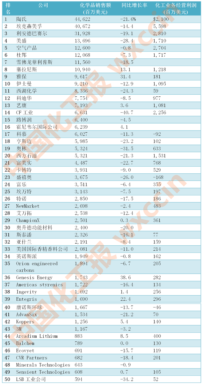这种转变最终会导致资本货物行业发现自己的投资失误——他们先前认为可以盈利的产品未能带来预期收益,因为终端消费者的实际购买力并没有增加。这种过程中,生产高级财货的投资被证明是一种资源浪费,因为市场需求实际上并没有增加到足以支持这种生产扩张的程度。不少人在欢呼美国光是几大互联网及科技企业的市场就超过了中国A股,认为这是美国经济强劲的表现。近日,《美国化学与工程新闻》(C&EN)公布的2024美国化工企业50强榜单显示,大多数美国化工公司在2023年都经历了痛苦且艰难的库存调整。由于多数客户选择消耗自身已有的原材料库存,导致市场需求疲软,但过快的产能增长导致供应一直在增加。这种产能大于需求的现象,在聚乙烯和聚丙烯市场尤为明显,近几年内都不会完全恢复到供求平衡状态。 今年对美国前50大化工生产商的调查显示,这种衰退显而易见。据统计,上榜的50家化学品制造商2023年的化工业务销售收入总额为3217亿美元,同比下降14.5%,其中38家公司收入下跌。