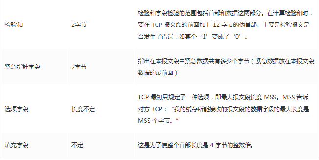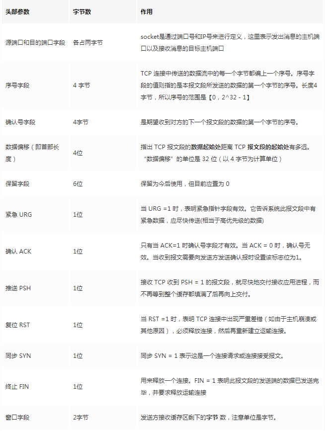 TCP首部固定长度是20字节,下面还有4字节是可选的。内容很多,但其中有一些我们比较熟悉的:源端口,目标端口。嗯?socket不是还需要IP进行定位吗?IP地址在网络层被附加了。其他的内容后面都会慢慢讲解,作为一篇总结文章,这里放出查阅表,方便复习: