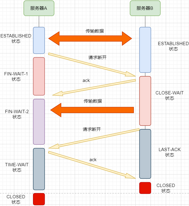 5. 最后,机器A等待两个报文存活最大时长之后,机器B 接收到ACK报文之后,均关闭连接,进入CLASED状态